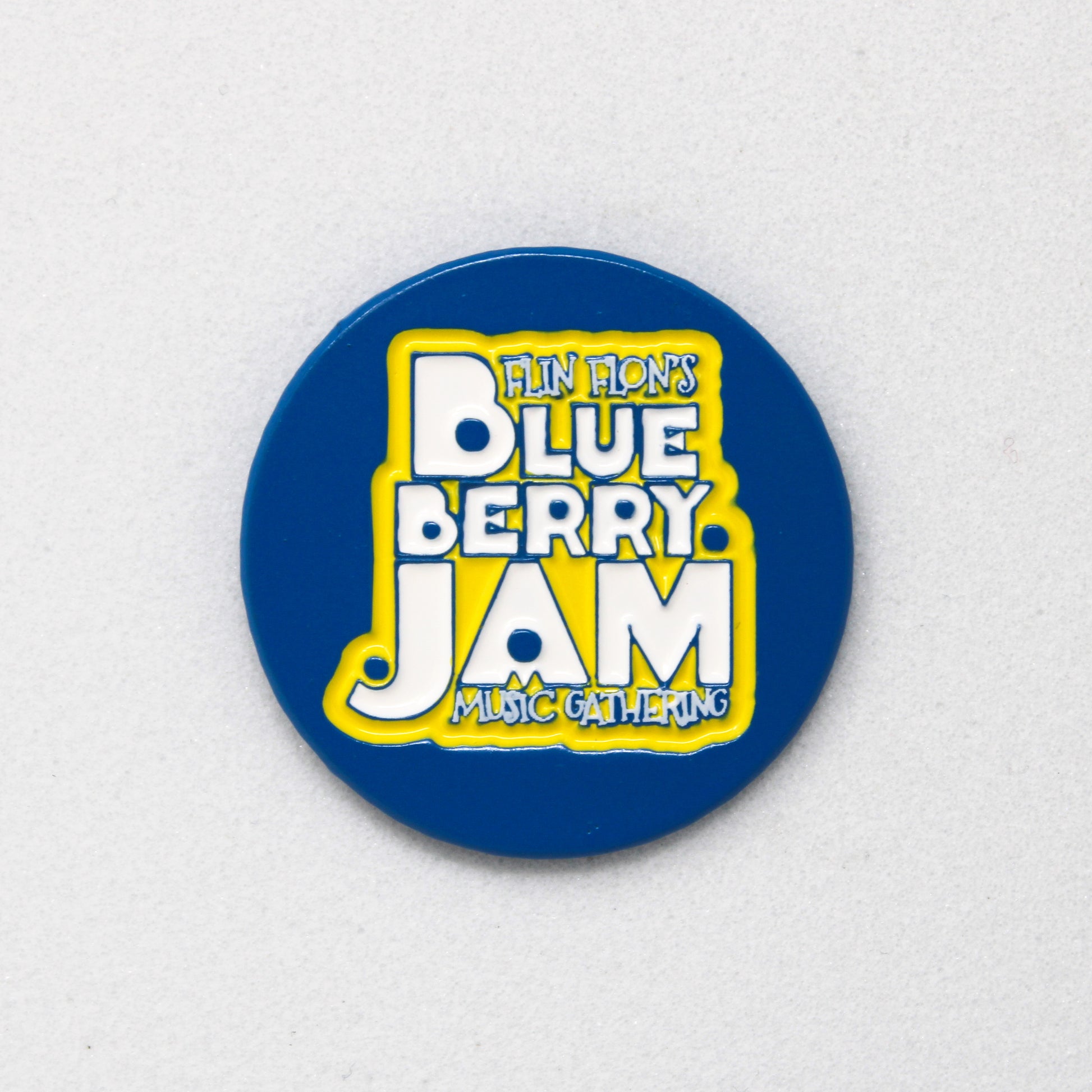 1" Blueberry jam pin. Flin Flon Blueberry Jam music gathering pins.
