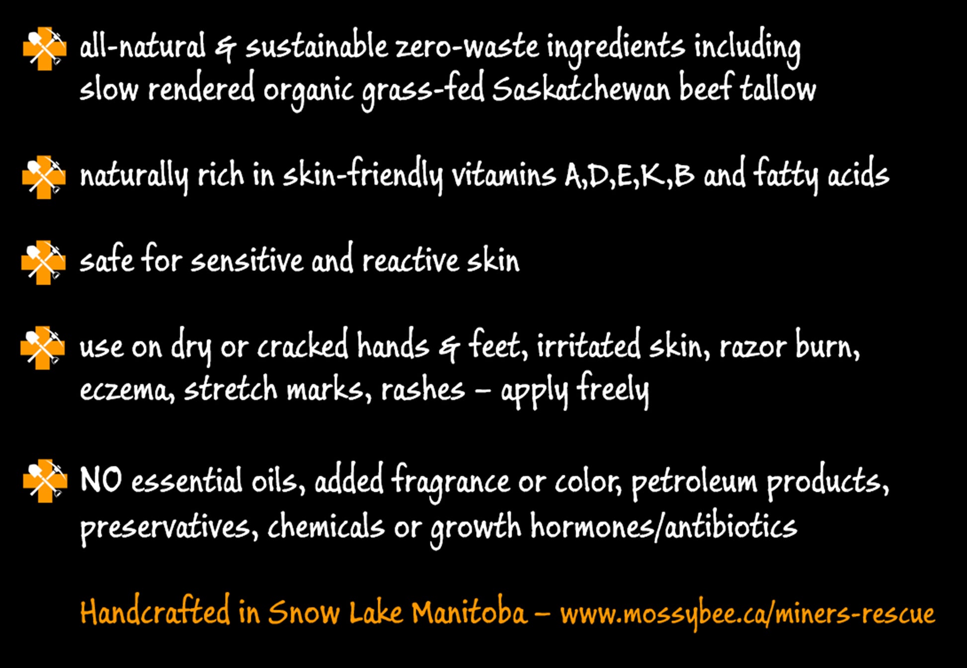 What is tallow and why use it on my skin? Tallow is fat from cows, bison, deer and other ungulates (grass eaters). It is not lard, which is pig fat. Tallow has been used in various forms for hundreds of years as a skin treatment. NOT ALL TALLOW IS CREATED EQUAL - only grass-fed animals create fat containing beneficial nutrients. This balm does not contain tallow from grain, corn or by-product fed animals.Tallow is so effective because it is made of the same amino acids and cellular components that your skin contains, so it can be effectively absorbed to deliver direct nutrients and promote real healing. Store bought treatments just coat your skin and are often made of petroleum-based mineral oils or synthetic silicones. We source tallow from Saskatchewan grass-fed beef cattle raised on small certified organic farms subject to ethical and sustainable farming practices, free of antibiotics and growth hormones. It is slow-rendered and purified at low temperatures to preserve the integrity of the nutrients and enzymes. We consider tallow a zero-waste ingredient, as it is often discarded - we transform it into an extremely beneficial skin-friendly balm with immense benefits.