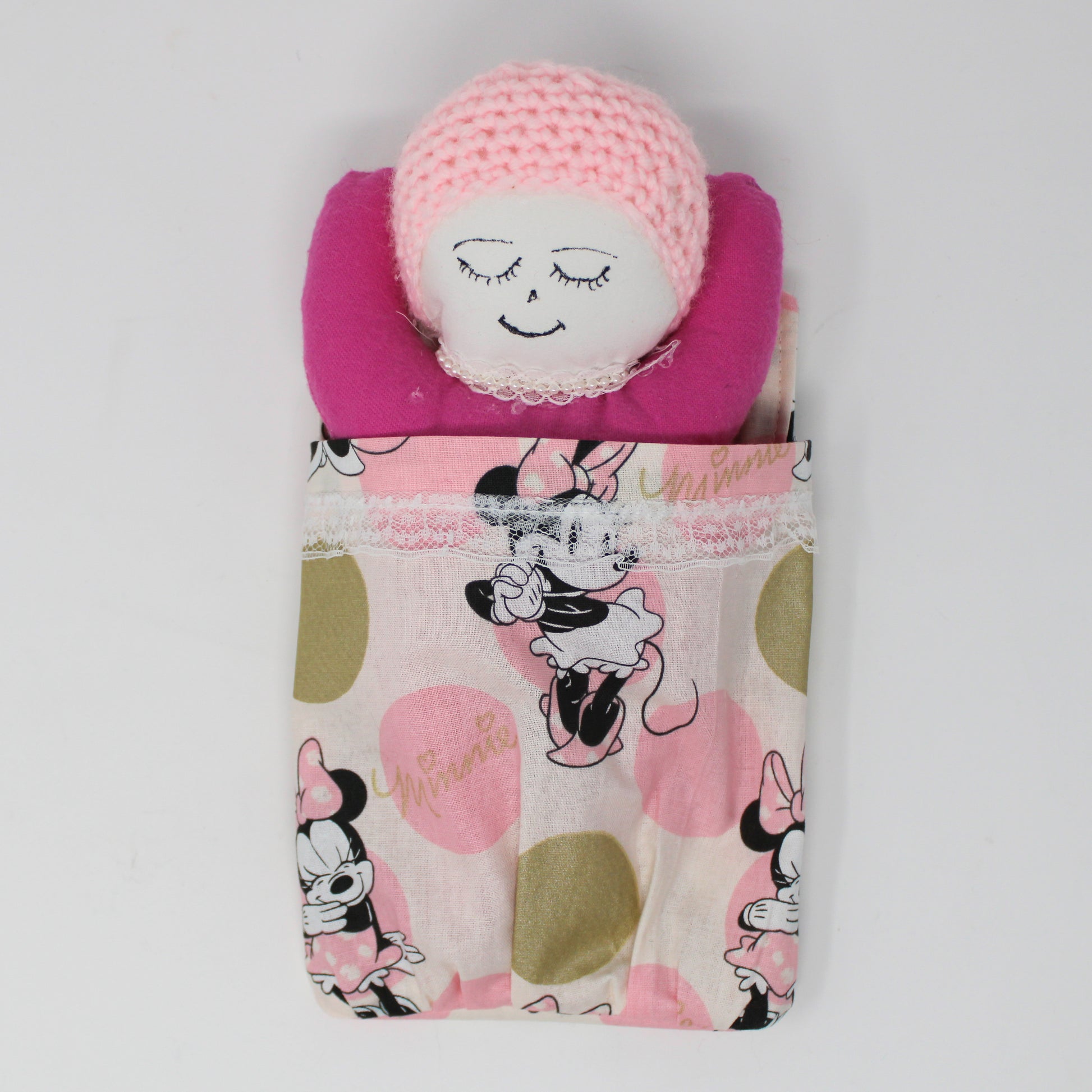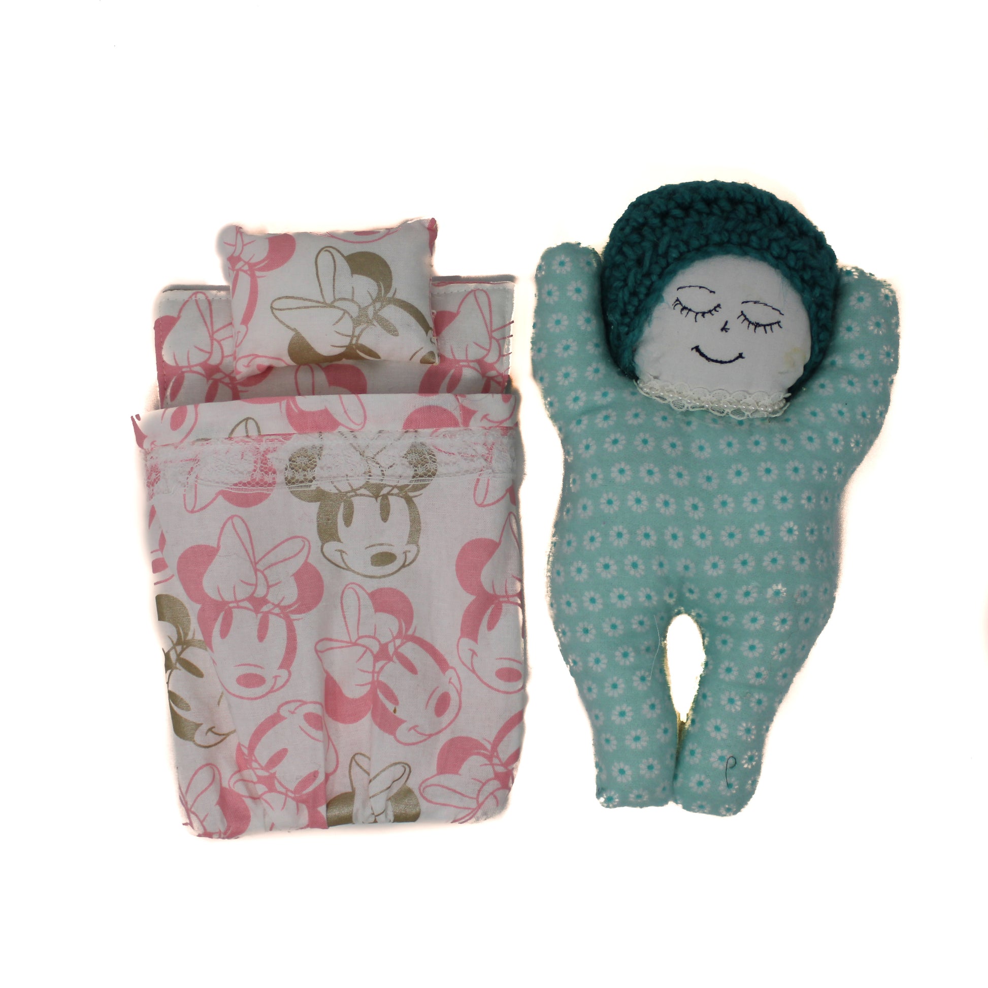 Sweet little baby dolls that come with their own bed. Each is hand sewn and knit.